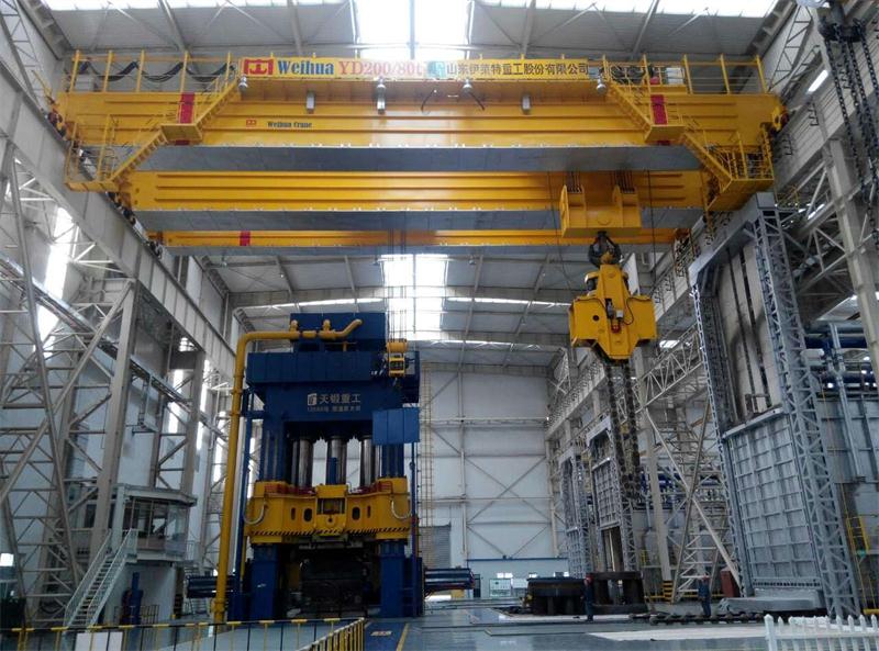 鍛造起重機(jī)的組成:電控系統(tǒng)、主(副)小車、起重機(jī)運(yùn)行機(jī)構(gòu)、橋架、吊具、翻料器等。